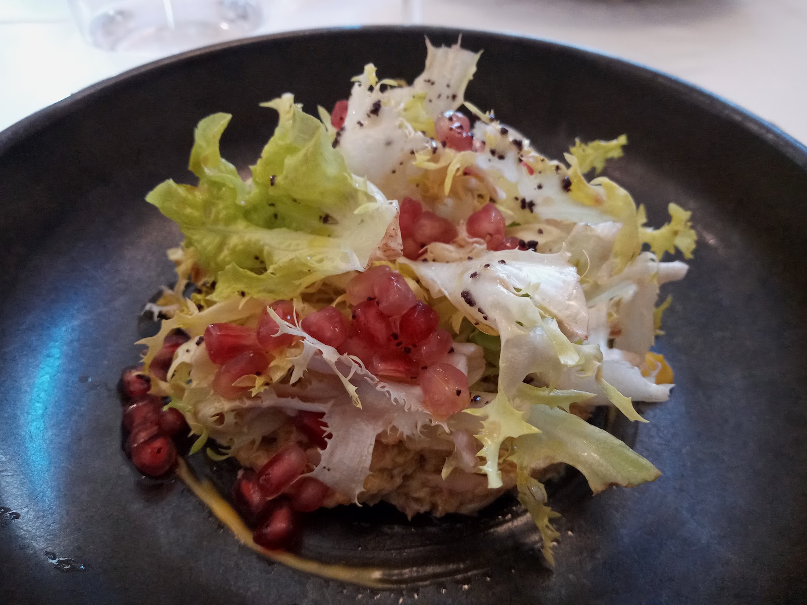 -Crema de calabaza con aceite de albahaca (agradable)-Garbanzos de La Hoya estofados con matanza (rico)-Croquetas de cocido (buena textura, pero algo anodinas)-Ensalada de escarola, granada y pularda escabechada (el impresionante ave salvaba un plato con un exceso de vinagre evidente)-Huevo frito con salsa de foie y trufa fresca (muy bien hecho, goloso y efectivo)-Arroz de verduritas y longaniza (exquisito, gran punto y potencia)-Rodaballo con risoni de setas (pescado bien tratado, conjunto algo deslavazado)-Magret de pato con puré de manzana (obvio, pero resultón, los champiñones crudos me gustan mucho en este plato)-Quesos del entorno (buena selección, ojalá más restaurantes incorporaran queso en el menú)-Cuatro chocolates (acertado postre de chocolates y texturas variados, gran helado de chocolate ruby)